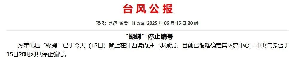 热带低压“蝴蝶”已于15日晚上在江西境内进一步减弱,目前已很难确定其环流中心,中央气象台于15日20时对其停止编号。