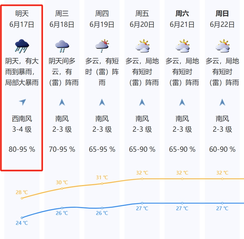 19-22日:转多云炎热天气,局地有短时(雷)阵雨,最高气温33℃左右,中北部及人口密集区35℃或以上。